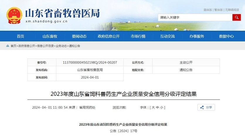近日,山東省畜牧獸醫(yī)局發(fā)布公告,公布了2023年度飼料獸藥生產(chǎn)企業(yè)質(zhì)量安全信用分級(jí)評(píng)定結(jié)…